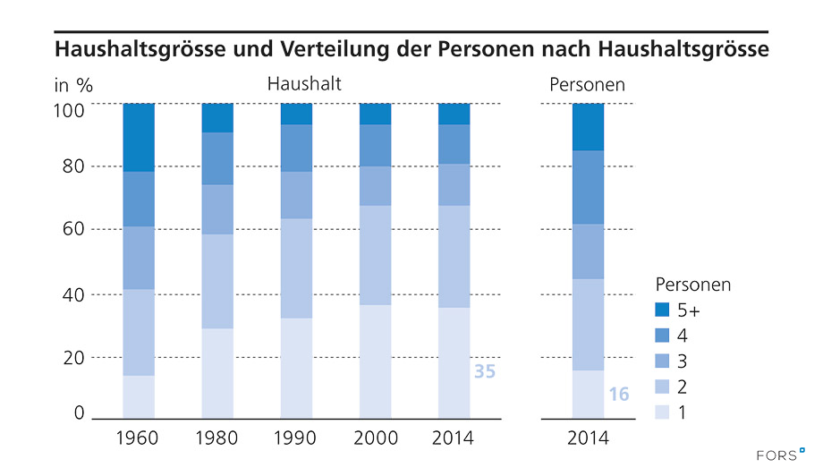Nur Personen in Privathaushalten (ausgeschlossen: Alters- und Heimbevölkerung, Gefängnisinsassen, Klöster u. a.). Lesebeispiel: 2014 sind 35% aller Haushalte Einpersonenhaushalte, aber nur 16% aller Personen (der Wohnbevölkerung) lebt in Einpersonenhaushalten.