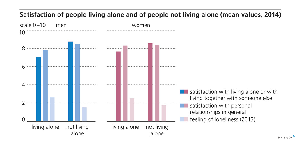 Satisfaction of people living alone and of people not living alone