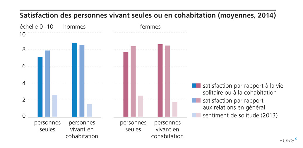 Questions posées: « Dans quelle mesure êtes-vous satisfait(e) de vivre seul(e)/ de la vie en commun dans votre ménage ? » « Etes-vous satisfait(e) de vos relations personnelles, familiales et sociales ? » (0 signifie « pas du tout satisfait » et 10 « tout à fait satisfait »). « Vous sentez-vous seul(e) dans la vie ? » (0 signifie « pas du tout » et 10 « extrêmement »).