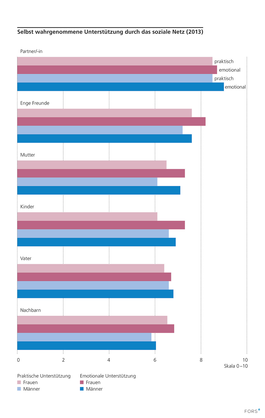 Fragestellung: «Falls Sie es nötig hätten, inwiefern könnte Ihnen ihr Kind, ihre Mutter, ihr Vater (…) praktisch helfen, d. h. mit konkreter Hilfe oder nützlichen Ratschlägen (0 bedeutet ‹gar nicht› und 10 ‹sehr viel›)? Und inwiefern kann ihr Kind, ihre Mutter, ihr Vater (…) für Sie da sein, wenn es nötig ist, zum Beispiel indem sie Verständnis zeigen oder mit Ihnen reden (0 bedeutet ‹gar nicht› und 10 ‹voll und ganz›)?»