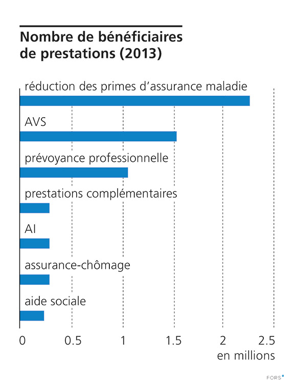 Sources: OFAS, statistique des assurances sociales (les données concernant la prévoyance professionnelle datent de 2012) et OFS, statistique de l’aide sociale