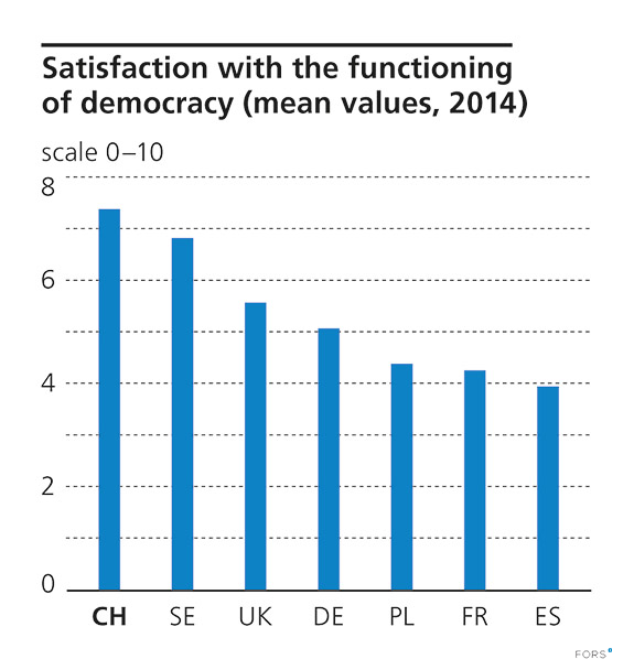 Question wording: “And to what extent are you satisfied with the way in which democracy functions in Switzerland (0 means ‘extremely dissatisfied’ and 10 ‘extremely satisfied’)?”
