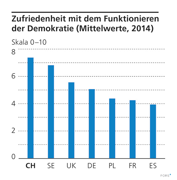 Fragestellung: «Und wie sehr sind Sie mit der Art und Weise, wie die Demokratie in der Schweiz funktioniert, zufrieden (0 bedeutet ‹äusserst unzufrieden› und 10 ‹äusserst zufrieden›)?»