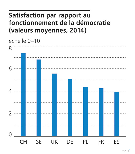 Question posée: « Et dans l’ensemble, dans quelle mesure êtes-vous satisfait/e de la manière dont la démocratie fonctionne en Suisse ? (0 signifie ‹ très insatisfait/e › et 10 ‹ très satisfait/e ›). »