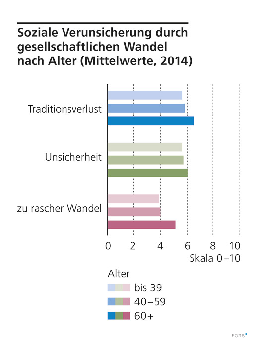 Fragestellung: Traditionsverlust: «Es scheint mir manchmal, als würden viele Sachen, die unsere Eltern wertgeschätzt haben, vor unseren Augen zerfallen.» Unsicherheit: «Alles ist so unsicher heutzutage, dass im Grunde genommen fast alles passieren könnte.» Zu rascher Wandel: «Alles ändert sich heutzutage so schnell, dass es mir oft schwer fällt zu entscheiden, welchen Regeln ich folgen soll.» Jeweils Skala 0 (überhaupt nicht einverstanden) bis 10 (vollkommen einverstanden).
