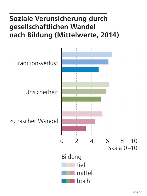 Fragestellung: Traditionsverlust: «Es scheint mir manchmal, als würden viele Sachen, die unsere Eltern wertgeschätzt haben, vor unseren Augen zerfallen.» Unsicherheit: «Alles ist so unsicher heutzutage, dass im Grunde genommen fast alles passieren könnte.» Zu rascher Wandel: «Alles ändert sich heutzutage so schnell, dass es mir oft schwer fällt zu entscheiden, welchen Regeln ich folgen soll.» Jeweils Skala 0 (überhaupt nicht einverstanden) bis 10 (vollkommen einverstanden).