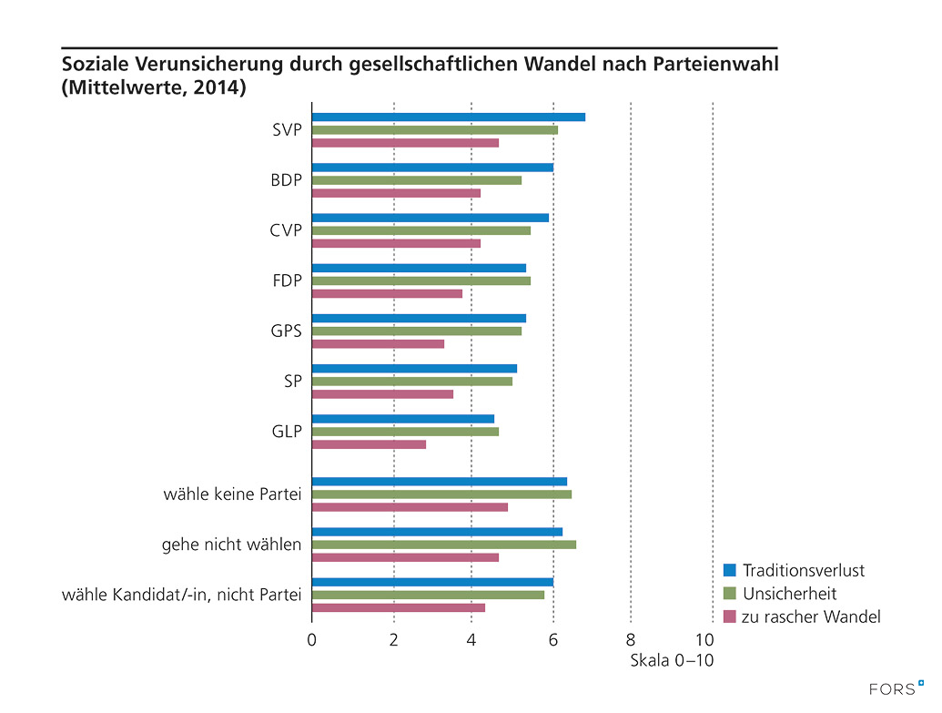 Fragestellung: Traditionsverlust: «Es scheint mir manchmal, als würden viele Sachen, die unsere Eltern wertgeschätzt haben, vor unseren Augen zerfallen.» Unsicherheit: «Alles ist so unsicher heutzutage, dass im Grunde genommen fast alles passieren könnte.» Zu rascher Wandel: «Alles ändert sich heutzutage so schnell, dass es mir oft schwer fällt zu entscheiden, welchen Regeln ich folgen soll.» Jeweils Skala 0 (überhaupt nicht einverstanden) bis 10 (vollkommen einverstanden). Parteienwahl: «Welche Partei würden Sie wählen, wenn morgen Wahlen wären?»