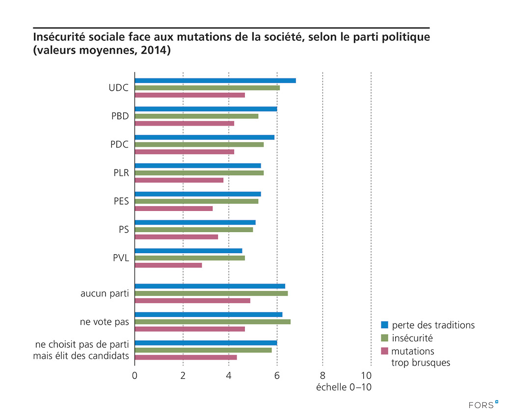 Question posée: perte des traditions: « J’ai souvent l’impression que beaucoup de choses auxquelles nos parents attachaient de l’importance tombent en ruine sous nos yeux. »; Incertitude : « Tout est si incertain de nos jours qu’on dirait presque que tout peut arriver. »; mutations trop brusques: « Tout change aujourd’hui si vite que j’ai souvent de la peine à décider quelles sont les règles à suivre. » : Réponses exprimées au moyen d’une échelle de 0 (« pas du tout d’accord ») à 10 (« tout à fait d’accord »). Parti: « Pour quel parti voteriez-vous si des élections avaient lieu demain? ».
