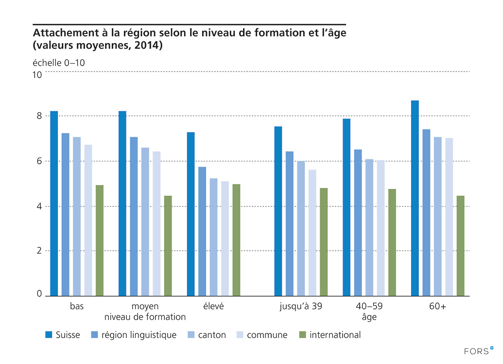 Les personnes ont été interrogées pour savoir dans quelle mesure elles ressentaient un attachement à leur commune de domicile, à leur canton de résidence et à la Suisse, sur une échelle de 0 (« pas du tout attachée ») à 10 (« très attachée »).