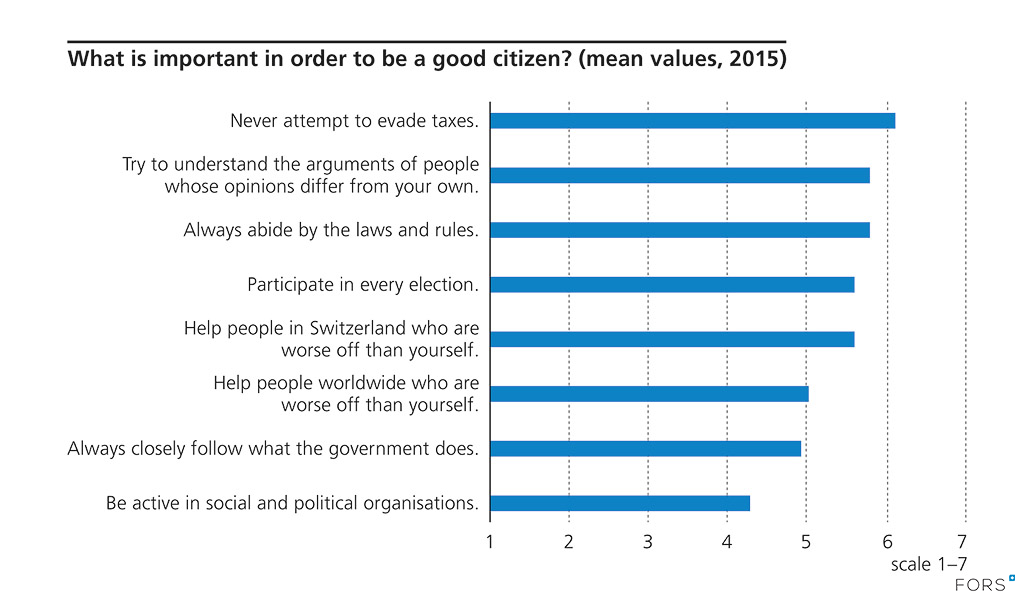 Question wording: “There are different opinions about what is required to be a good citizen. If you think about your personal convictions, on a scale between 1 and 7, where 1 means ‘not at all important’ and 7 ‘very important’, how would you assess the importance of the following things…?”