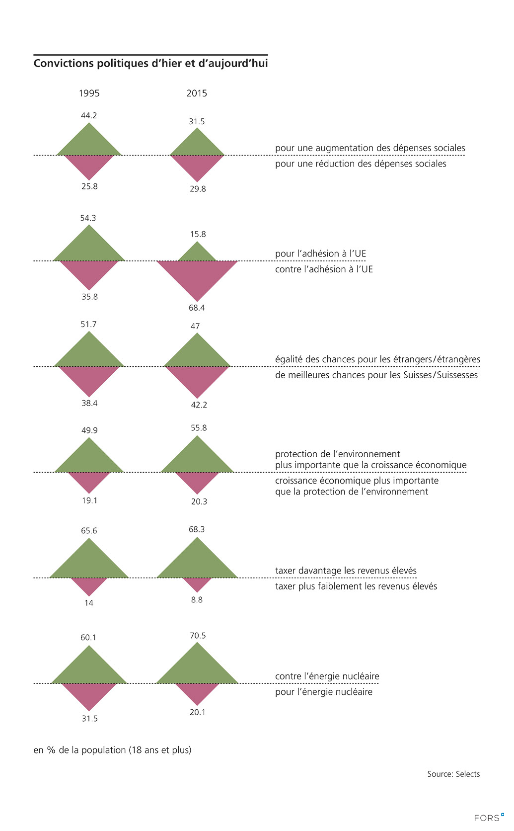 En 2015, ont été recensées les catégories « plutôt favorable » et « fortement favorable » ainsi que « plutôt défavorable » et « fortement défavorable » de manière à permettre la comparaison avec 1995.