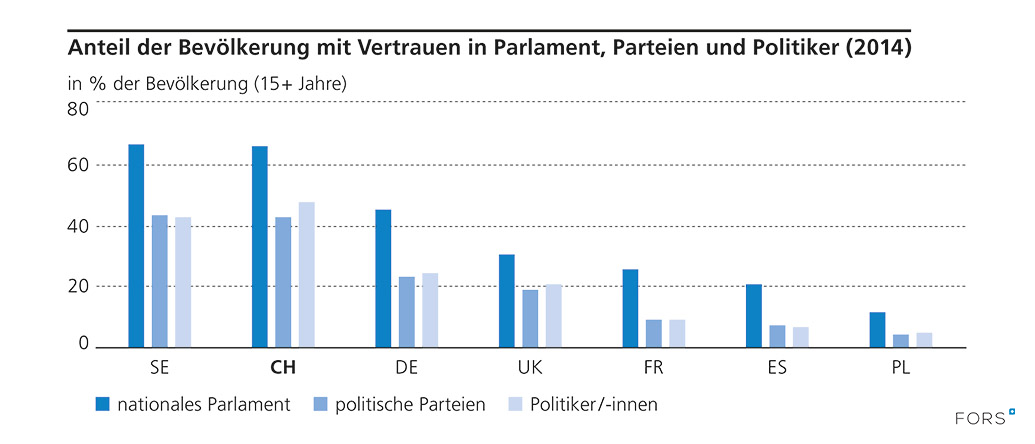 Fragestellung: «Bitte sagen Sie mir, wie Sie persönlich Ihr Vertrauen (in Parlament, politische Parteien, Politiker) einstufen würden?» Angegeben sind die Anteile an Befragten, die Werte zwischen 6 und 10 auf einer Skala 0 bis 10 genannt haben.