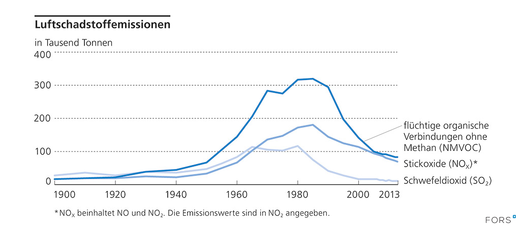 Stickoxide (NOX) beinhaltet NO und NO2. Die Emissionswerte sind in NO2 angegeben. Feinstaubkonzentration: Werte vor 1997 wurden nach einer anderen Methode ermittelt als ab 1997. Grenzwert für Feinstaubkonzentration (Jahresmittel): 20 Mikrogramm pro Kubikmeter.