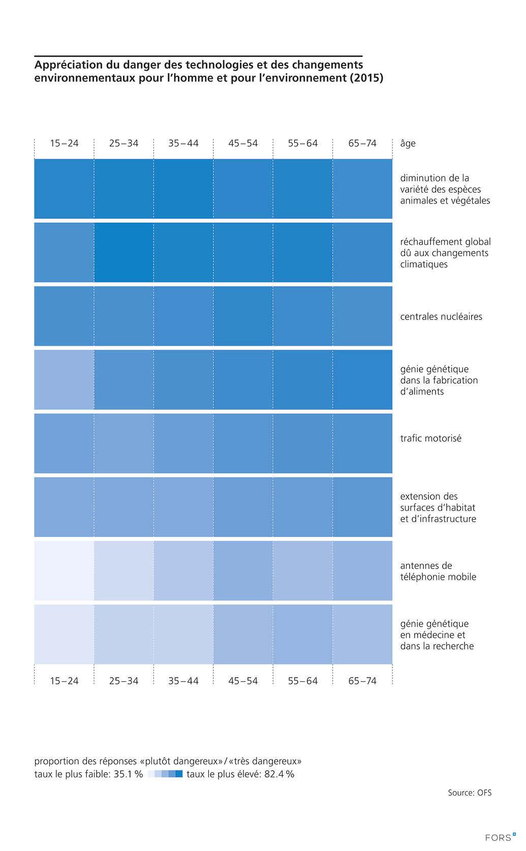 Question posée: « Combien est-il dangereux pour l’homme et l’environnement en Suisse […] ? ». Catégories de réponse : « très dangereux », « plutôt dangereux », « plutôt pas dangereux », « pas du tout dangereux », « ne sait pas ». L’appréciation de dangereux a été considérée lorsque la personne a coché « très dangereux » ou « plutôt dangereux ».