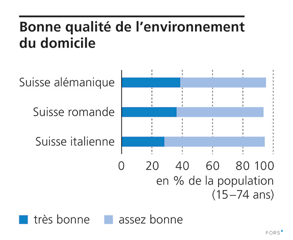 Questions posées: « Comment jugez-vous la qualité de l’environnement autour de chez vous/en Suisse/ dans le monde? Veuillez indiquer, pour chacun des facteurs suivants [entre autres ‹ La qualité de l’environnement là où vous vivez ›], à quel point il influence très fortement, plutôt fortement, plutôt pas fortement, pas du tout fortement votre qualité de vie ? »