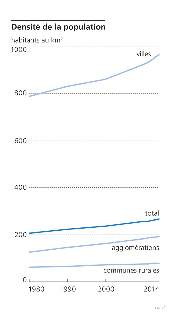 Densité démographique = population résidante permanente par km2 de surface productive (c’est-à-dire la superficie de la Suisse sans les glaciers et surfaces rocheuses impraticables).