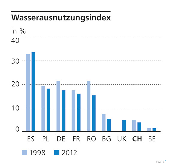 Wasserausnutzungsindex = Jährlicher Frischwasserverbrauch in % der langfristigen Frischwasserressourcen (Oberflächen- und Grundwasser).