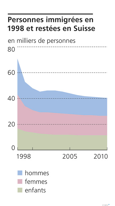 Ne sont pas prises en compte les titulaires d’autorisations de courte durée qui sont arrivés en Suisse en 1998 et ont quitté le pays la même année.
