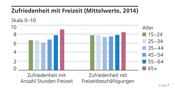 Fragestellung: «Wie zufrieden sind Sie mit der Anzahl Stunden Freizeit, die Sie haben? Wie zufrieden sind Sie mit den Aktivitäten, die Sie in Ihrer Freizeit machen? (0 bedeutet ‹gar nicht zufrieden› und 10 bedeutet ‹vollumfänglich zufrieden›).»