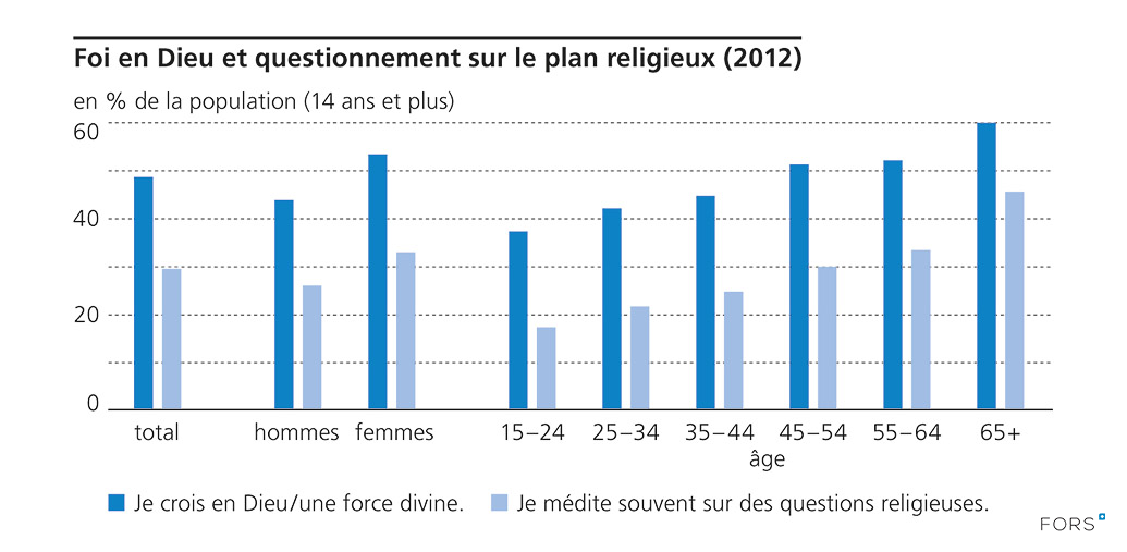 Question posée: « Dans quelle mesure croyez-vous en Dieu ou en quelque force divine (pas du tout, peu, moyennement, assez, beaucoup) ? Dans quelle mesure méditez-vous sur des questions religieuses (jamais, rarement, occasionnellement, souvent, très souvent) ? »