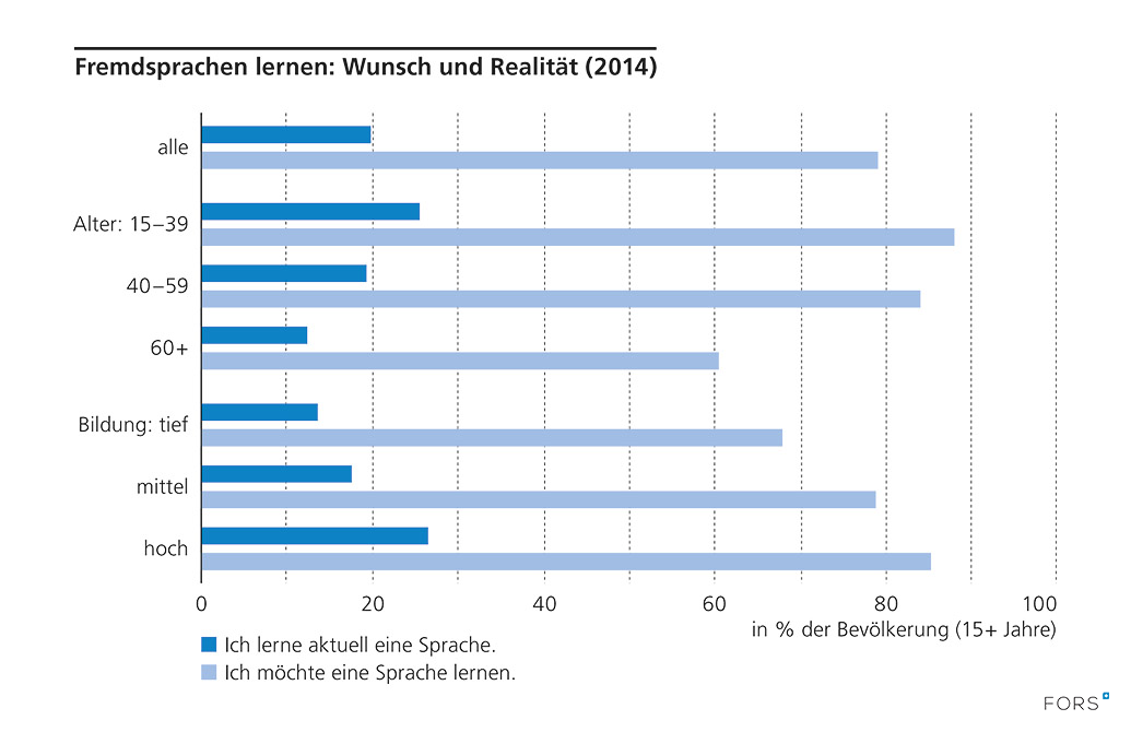 Fragestellung: «Haben Sie in den vergangenen 12 Monaten angefangen, eine oder mehrere Sprache zu lernen oder haben Sie Ihre Sprachkenntnisse vertieft? (Schüler/Studenten: ohne obligatorische Sprachkurse); Angenommen, es würde Ihnen weder an Geld noch an Zeit fehlen, gibt es eine oder mehrere Sprachen, wo Sie gerne lernen oder verbessern möchten?»