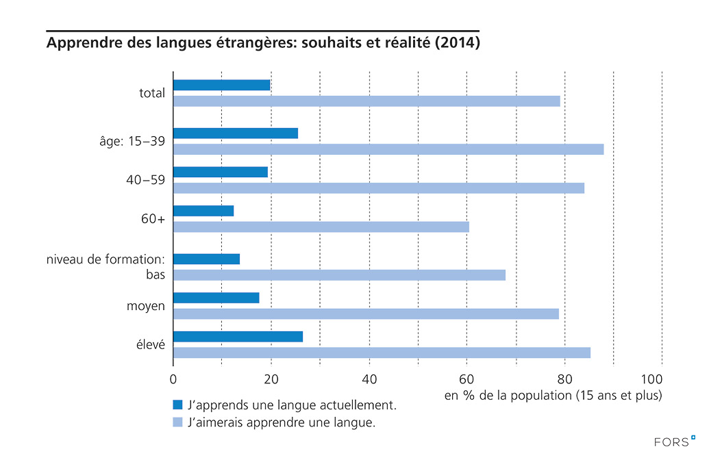 Question posée: « Au cours des 12 derniers mois, avez-vous débuté ou poursuivi l’apprentissage d’une ou plusieurs langue(s) ? (élèves/étudiants : cours de langue obligatoires exclus). » « A supposer que vous ne manquiez ni de temps, ni de ressources financières, y a-t-il une ou plusieurs langues que vous souhaiteriez apprendre ou mieux maîtriser ? »