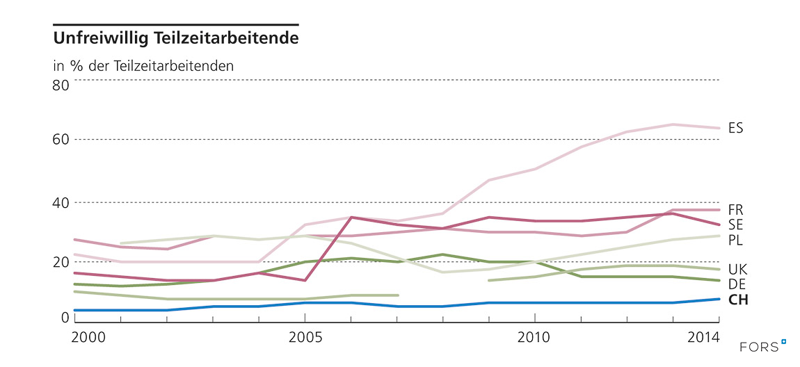 Teilzeitarbeit ist hier definiert gemäss nationalen Definitionen. Für die Schweiz beruhen die Zahlen auf der Auskunft von Erwerbstätigen, die ihre Haupterwerbstätigkeit als Teilzeitstelle benennen.