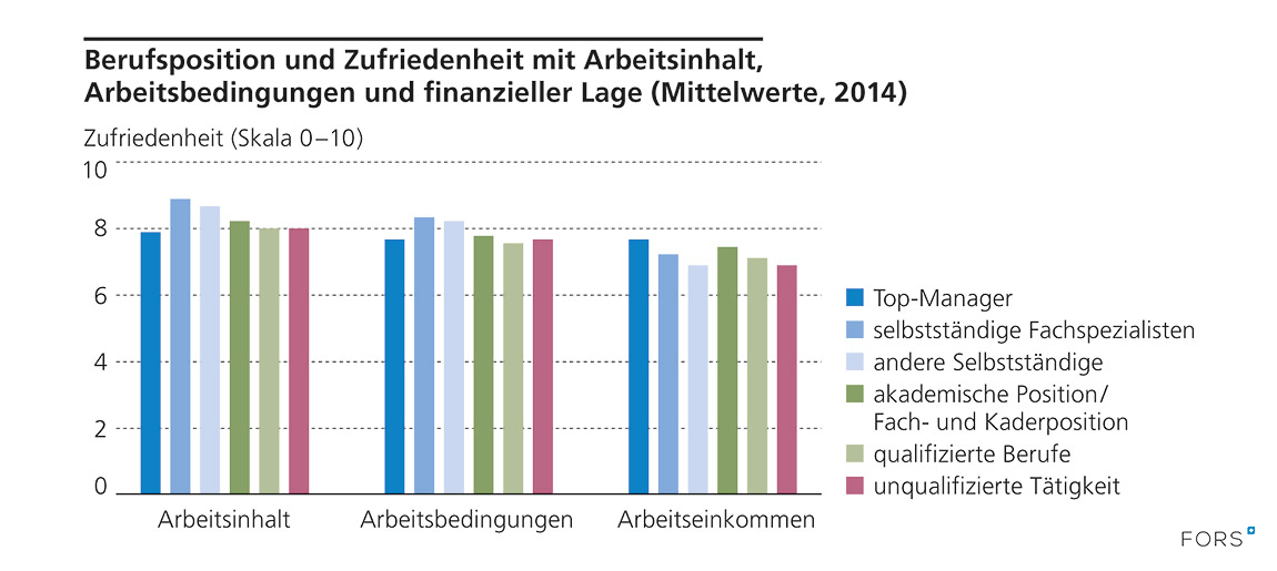 Fragestellung: «Können Sie mir für die folgenden Punkte (ihre Arbeitsbedingungen, wie interessant ihre Arbeit ist, mit dem Einkommen) angeben, wie Sie damit zufrieden sind?» (0 bedeutet «gar nicht zufrieden» und 10 «vollumfänglich zufrieden»).