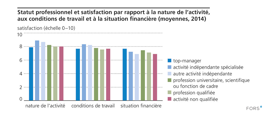Question posée: « Pouvez-vous m’indiquer sur une échelle allant de 0 ‹ pas du tout satisfait › à 10 ‹ tout à fait satisfait › votre degré de satisfaction pour chacun des points suivants (l’intérêt de vos tâches, vos conditions de travail, les revenus que vous tirez de votre travail) ? »