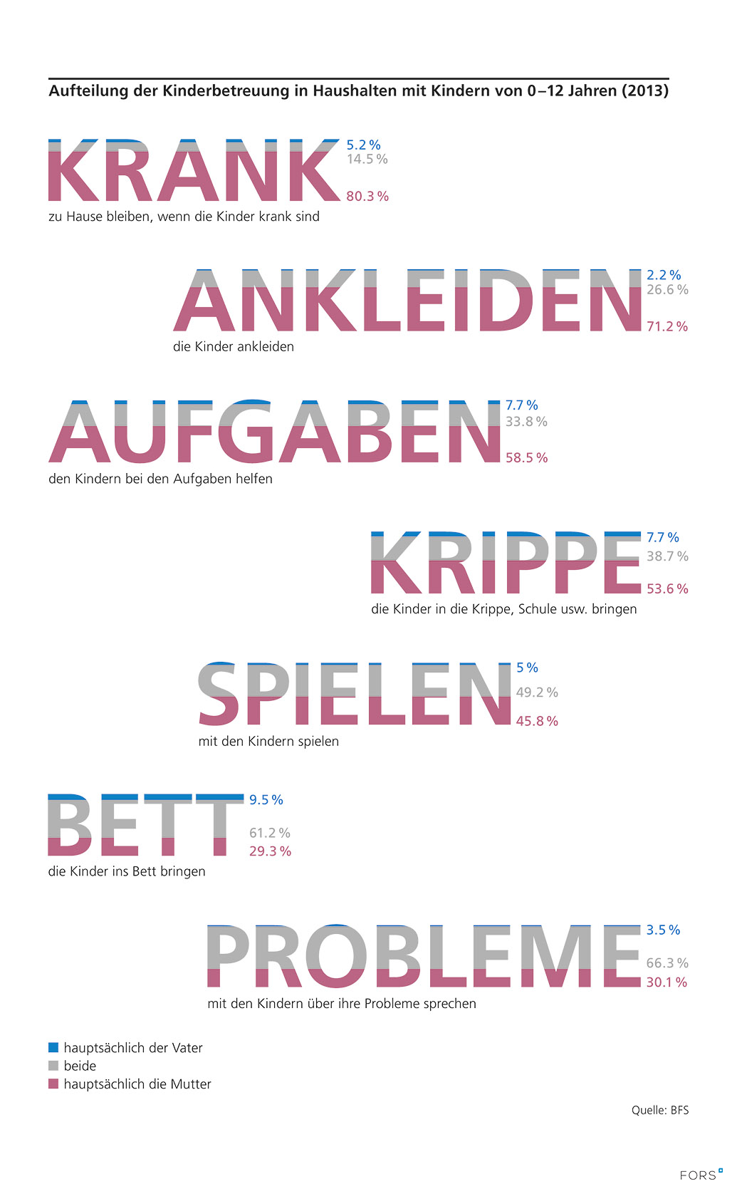 Quelle: BFS, Erhebung zu Familien und Generationen 2013 (thematische Erhebung). Befragt wurden Paarhaushalte mit Kindern zwischen 0 und 12 Jahren (Stichprobegrösse: 1971 Personen)