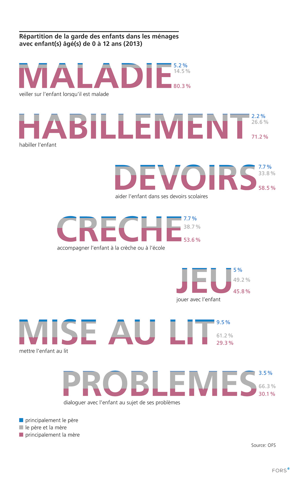 Source : OFS, enquête 2013 sur les familles et les générations (enquête thématique). Personnes interrogées: au total 1971 personnes (taille de l’échantillon) appartenant à des ménages en couple avec enfant(s) de moins de 12 ans